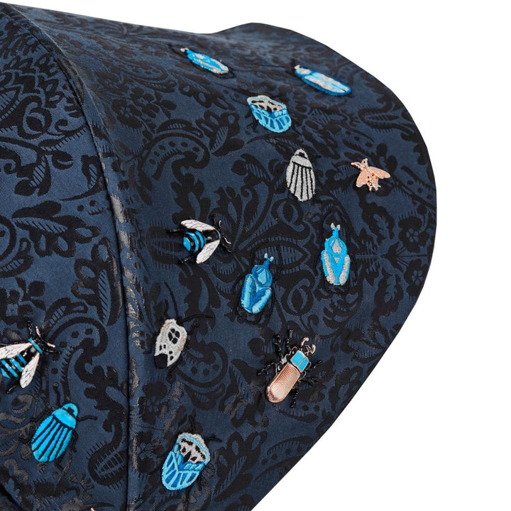 The COYA: an exclusive traveler that’s sure to turn heads. Peek into the mysterious jungle full of hidden secrets and the beauty of nature, led by majestic sparkling beetles. Why beetles? The infinite variety of shapes in the world of beetles and their shimmering exteriors have inspired designers and style icons of many generations, from Cleopatra to Karl Lagerfeld. With Alexander McQueen, butterflies, bees, and beetles conquered the international catwalks. At Chanel’s 2019 Métier d’arts Show, the German fashion designer staged the Egyptian sun beetle in a particularly opulent manner. Every one of them is a masterful detail in the craftsmanship of our strollers. The finest, baroque-style jacquard fabric in the deepest blue color was inspired by a mystical night sky in the Amazon forest.