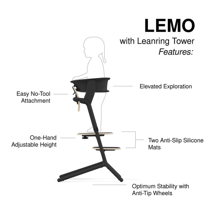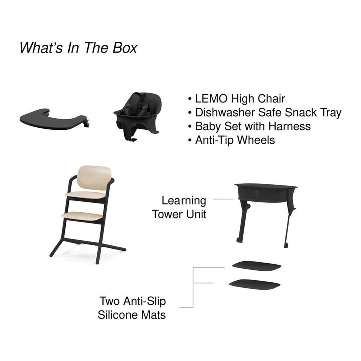 - INCLUDES: LEMO 2 High Chair, dishwasher-safe snack tray, baby set with harness, LEMO Learning Tower with two anti-slip silicone mats