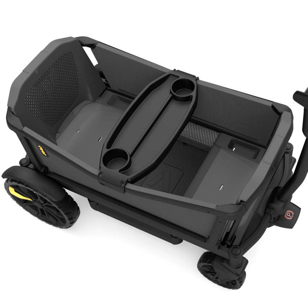 Cruiser can be pushed or pulled, or pulled alongside. It has two built in seats with 3-point harnesses for toddler comfort and safety, and a collapsible foot-well for ergonomic seating. It is maneuverable, adaptive, rugged, safe and mobile. A removable snack tray has two cup-holders built in, the sides have webbed pockets to hold necessities, and each seat has a built-in well for trinkets and snacks. Up to 6 cup holders can attach to keep refreshments in reach.