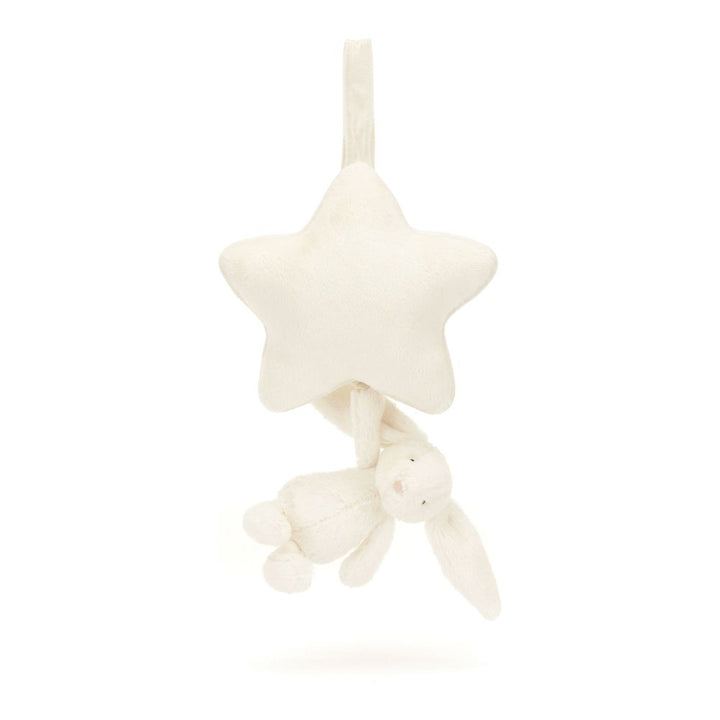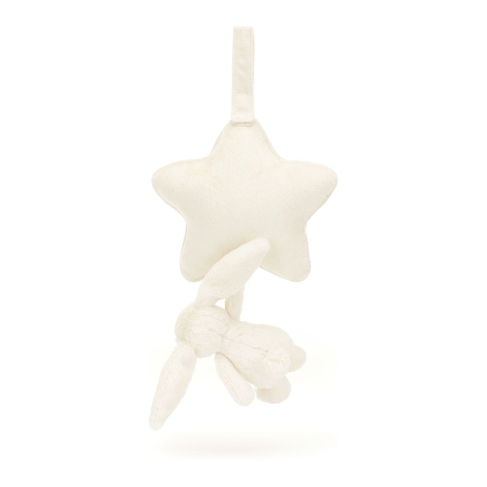 An enchanting newborn gift, let babies dream sweetly with a Bashful Bunny Musical Pull. Jellycat's most loved Bashful Bunny, in soft fur made from recycled fibres can be gently pulled to hear an original Jellycat lullaby. The cream star shaped musical pull with contrast trim can be attached to a crib or pram with a Velcro fastening