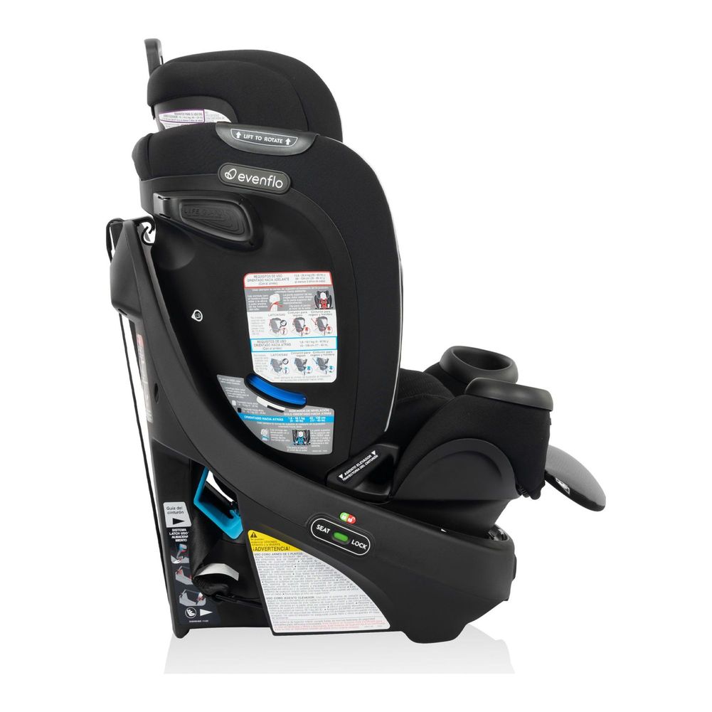 The future of car seat innovation is here: Introducing the Evenflo® Revolve360™ Rotational All-In-One Car Seat. Once again, Evenflo is leading the way with this extended use, rotational seat that’s easy to turn and easy to install. Designed for kids weighing 4 – 120 lb, the Revolve360 car seat makes loading and unloading your child a breeze (and easier on your lower back!) — in all three modes of use. Install just once for rear-facing and forward-facing – Sure360™ Safety Installation System with LockStrong™ belt-tensioning system and Tether360™ technology keep it safe, secure and simple. Packed with conveniences, the Revolve360 car seat also surrounds your child with everyday comfort and safety. From birth to ten-years-old, it’s truly a revolutionary way to get around. Additionally, this car seat features L.I.F.E. Guard — it’s Linear Impact Force Engineered to improve safety performance in side impact crashes