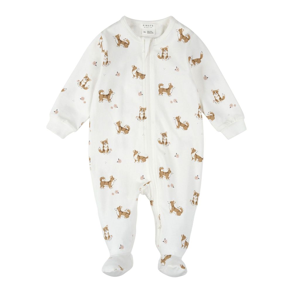 Petit Lem Organic Cotton Footed Sleeper in Corgi Prints on Off-White