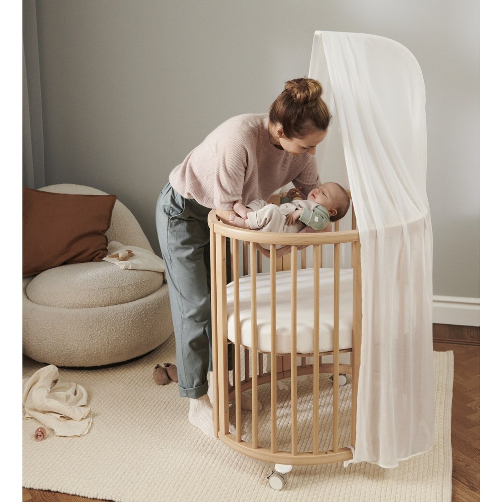 The Stokke® Sleepi™ Mini is the ideal first bed for your newborn. Creating a nest-like environment, it helps baby feel snug and secure. Soft oval design cocoons your baby offering comfort and familiarity for restful sleep and the sweetest of dreams. The drape rod and canopy make it a truly elegant addition to any nursery. Lockable swivel wheels can be used to rock your baby gently to sleep and makes your crib easy to move from room to room. At only 67 cm / 26,4 in inches wide, it’s amazingly space efficient, making it ideal for petite nurseries. The Stokke® Sleepi™ concept has been developed with sound sleep and safety in mind. It is available with a new firm and breathable Sleepi™ mattress which exceeds the highest safety standards. Accessorize with the breathable mesh liner and high-quality textiles.
