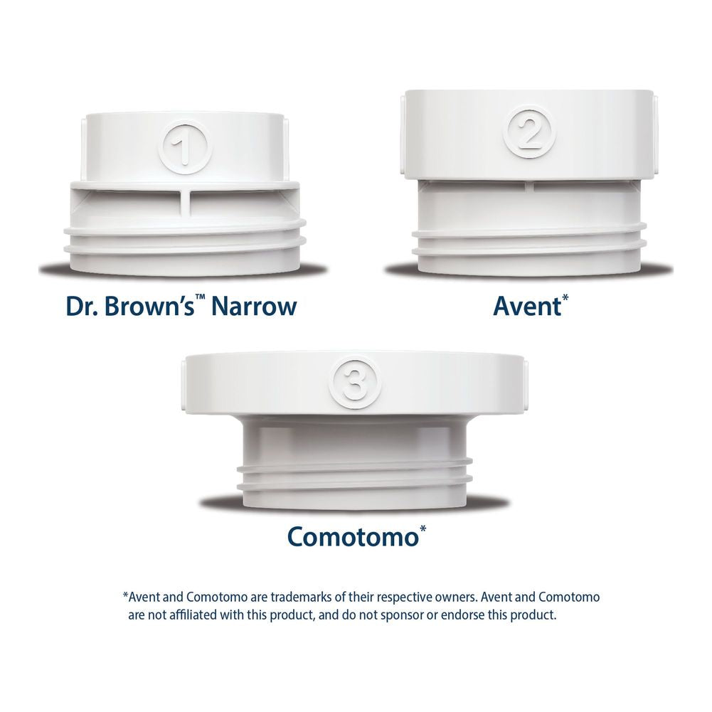 - Fits Dr. Brown's Wide-Neck bottles and includes 3 adapters to fit Dr. Brown's Narrow, Avent, and Comotomo bottles*