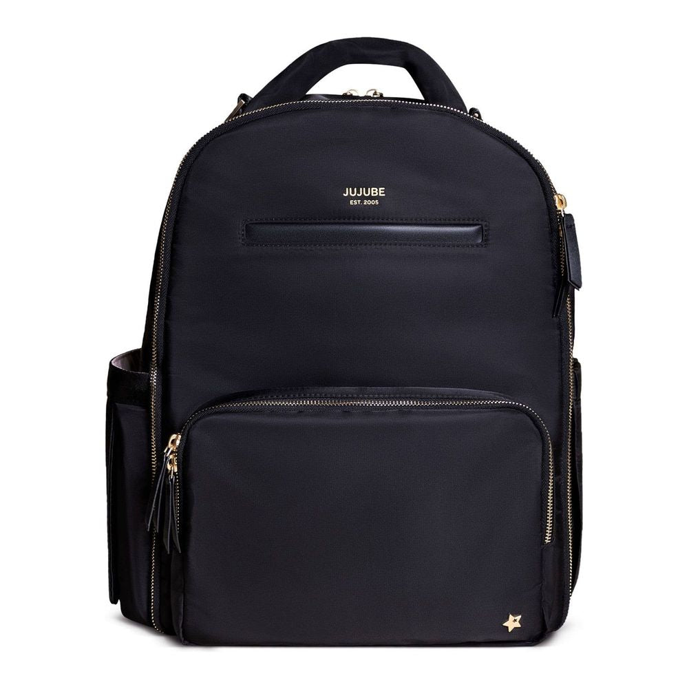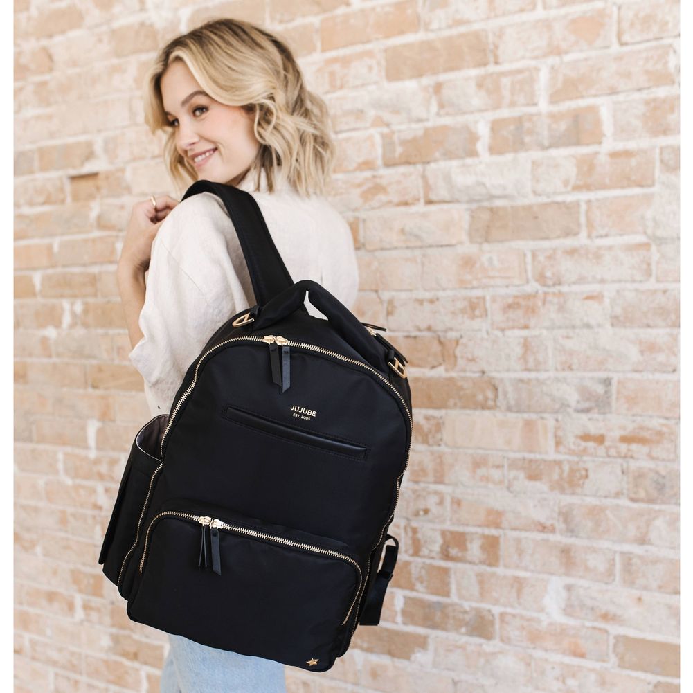 The Classic Backpack from JuJuBe has a sleek, innovative design that makes it easier than ever to stay organized on the go. This spacious, intuitively designed bag holds all your baby essentials—diapers, snacks, drinks, extra clothes, and more—plus personal items like your wallet, keys, and phone. Keep everything you need at your fingertips with an easy-access wipe pocket, insulated bottle pocket, and quick-reach cell phone pocket. The main compartment opens completely flat like a suitcase for easy packing, and the adjustable, contoured shoulder straps, trolley sleeve, and stroller straps add comfort and convenience. The Classic Backpack is machine-washable and features an odor-resistant lining and durable metal hardware, so it can handle whatever you throw at it.