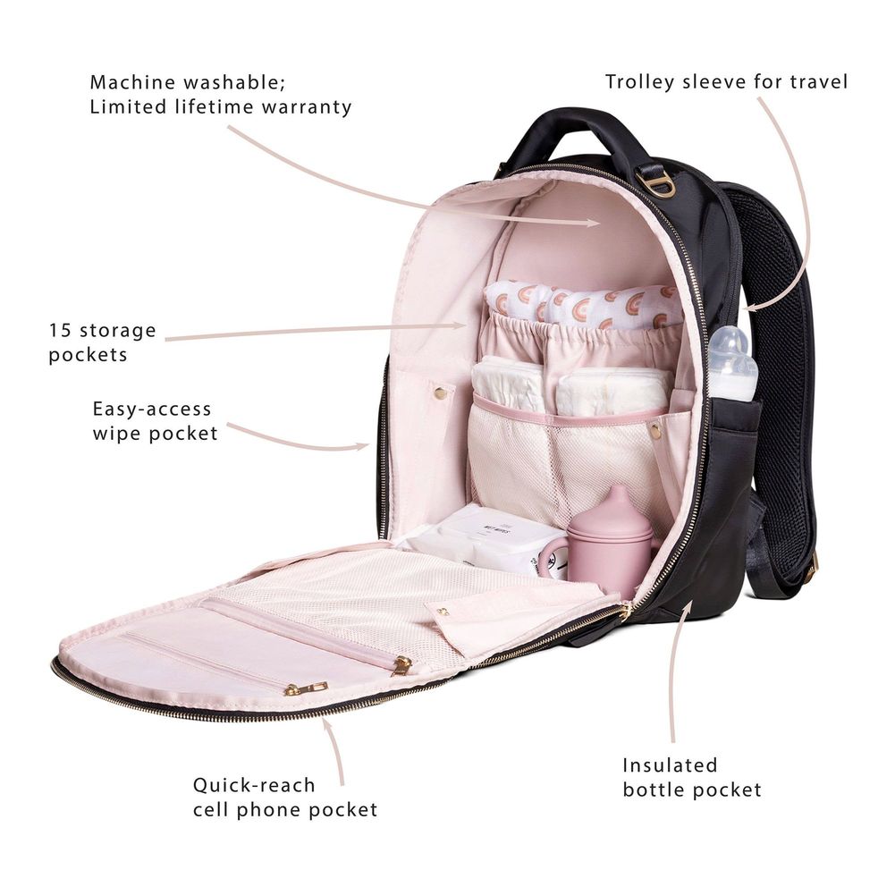 - 15 storage pockets, including a parent pocket for essentials and quick-reach cell phone pocket, insulated bottle pocket, easy-access wipe pocket, and trolley sleeve for travel
