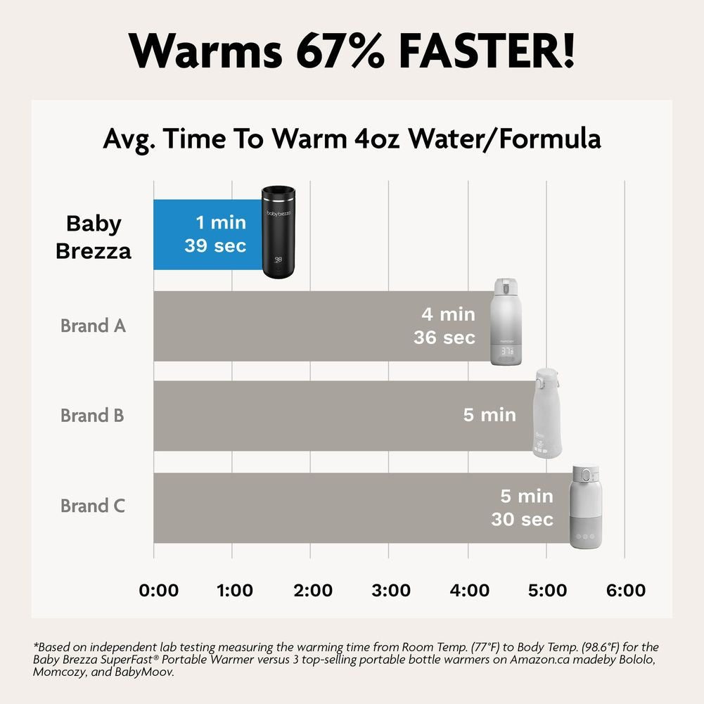The Baby Brezza SuperFast Portable Bottle Warmer is the fastest, most advanced way to warm breastmilk, formula, water or a filled milk storage bag on the go. It's clinically proven to warm up to 67% faster than other portable warmers, including 8 oz. in 3 minutes (from room temp to 98°F). Its Advanced Sensor Technology safely and evenly warms milk and formula from top to bottom, protecting nutrients. No more adaptors, leaks or turning bottles upside down! This rechargeable travel warmer warms up to eight 6 oz. bottles (from room temp to 98°F) on a full charge, and it easily fits in cupholders or bottle pockets in diaper bags and backpacks, cars and strollers.