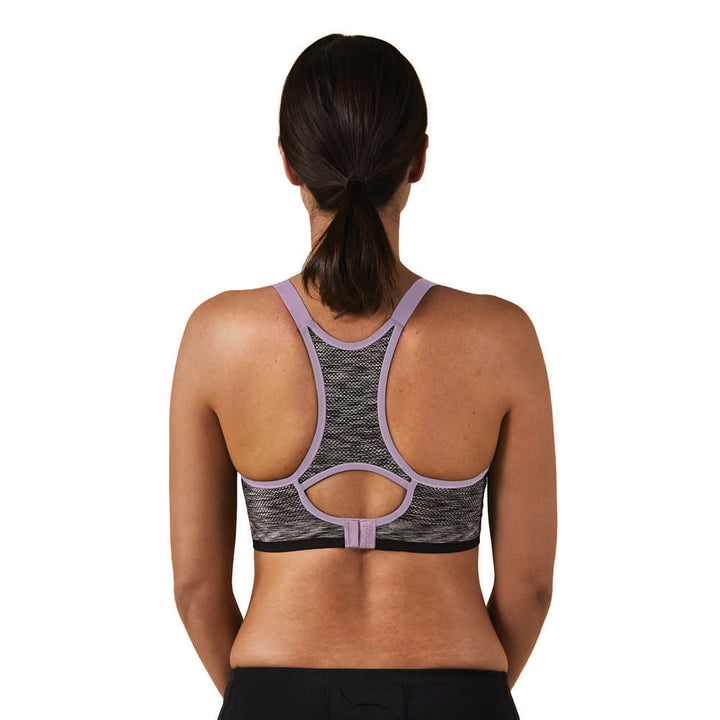 - Space dye effect with contrast trims and sleek racerback for a sporty look