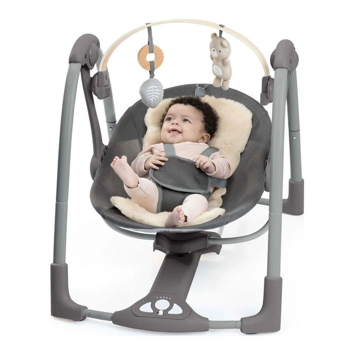 Your little one deserves a cozy environment to help keep them calm. Ingenuity's Every Season Swing 'n Go Portable Swing made with Air Flow technology is the simple, all-in-one solution to keeping baby consistently comfortable in any environment. The premium mesh fabric promotes airflow for baby and the extra cozy lambswool is 100% natural and sourced from Australia. Plus, 5 swing speeds with WhisperQuietâ„¢ motor provides less distractions and noise for baby.