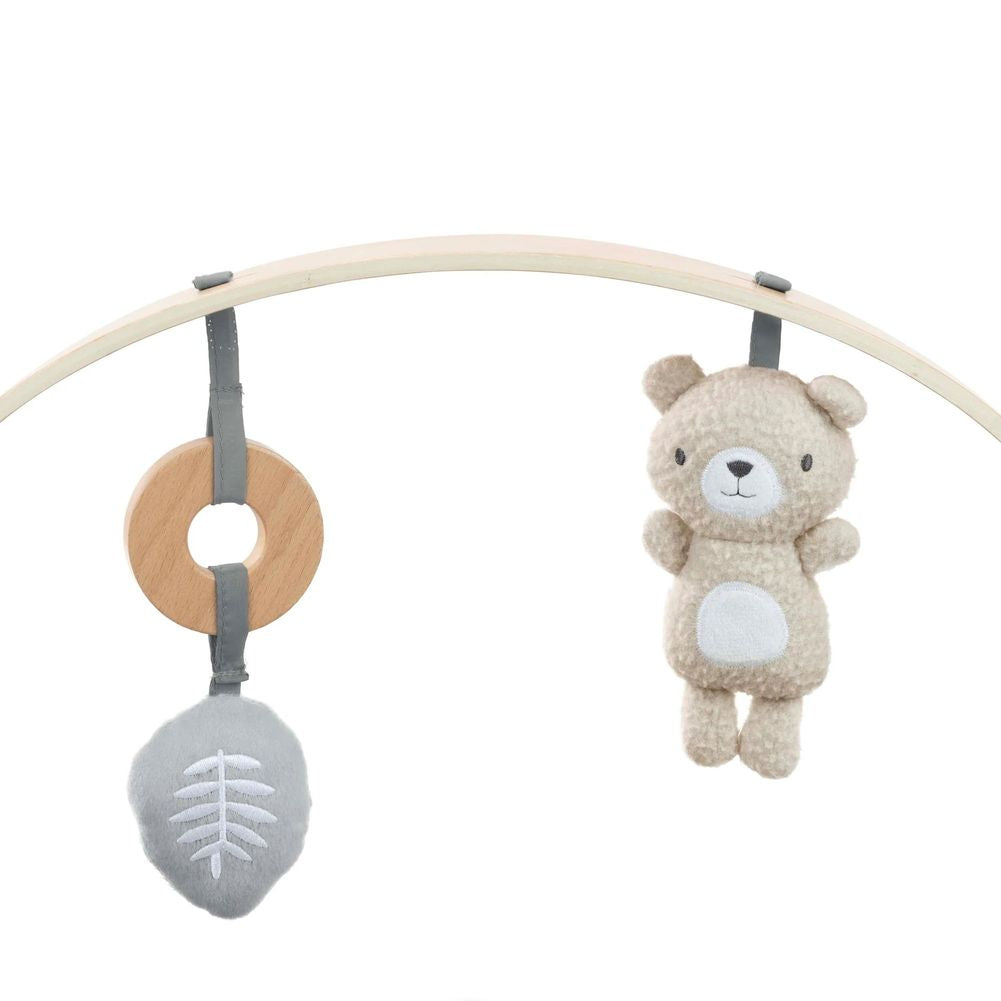 - A detachable toy bar, made with wood from a sustainable forest, includes a removable soft plush Nate the Bear character toy and wooden ring toy.