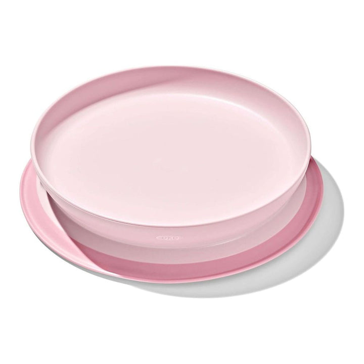 Cut down on mealtime messes with the OXO Tot Stick & Stay Suction Plate. The Plate features a silicone base that sticks surfaces until mealtime is over, preventing sliding, slipping and tipping. A parent-friendly opening makes removing the Plate simple for adults, but tough for kids. Tall, curved side walls allow for easy scooping and encourage self-feeding. When your child is finished, twist the Plate and base apart for quick cleaning in the dishwasher.