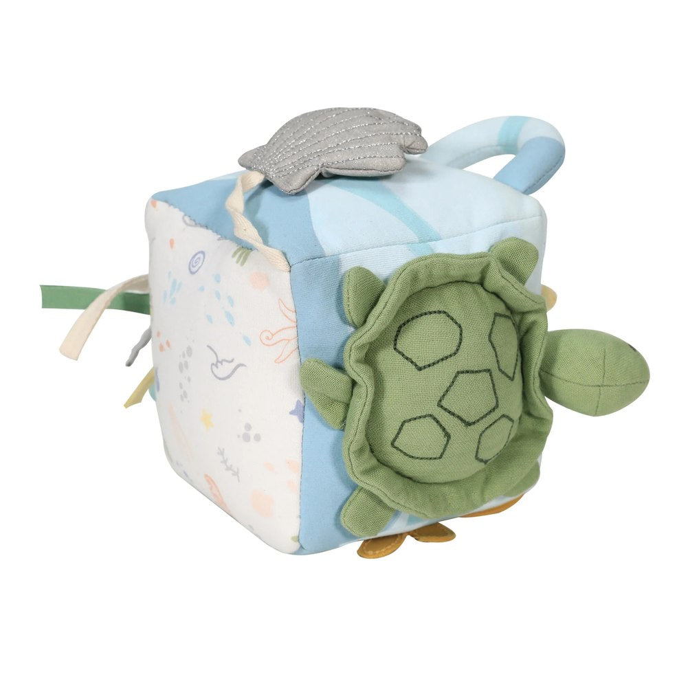 This soft little Organic Activity Cube with ocean animals contains many activities that stimulate baby’s senses. There is so much to discover and play with: different textures, a mirror, rattle & squeaker make sound with every movement. There is also a small turtle that likes to play by pulling his tail. This toy remains interesting and ensures fun times.