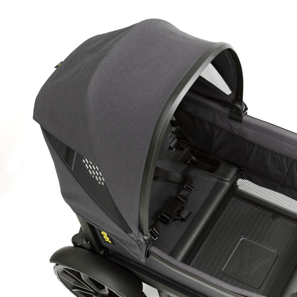 Veer's Retractable Canopy quickly and intuitively clips onto Cruiser's frame and easily extends up and down. One or two can be attached above either seat. A peak-a-boo window allows you to see your precious cargo and discreet, hidden magnets hold the window in the up position. Canopy works perfectly with Napper to create the perfect rest stop for young ones.