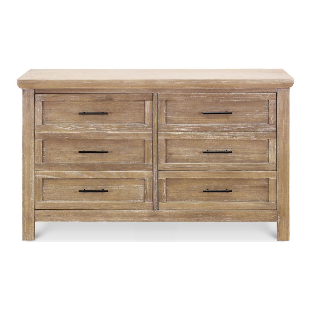 The Emory Farmhouse 6-Drawer Dresser is the perfect companion to the Emory Farmhouse 4-in-1 Convertible Crib. With matching thoughtful X-brace details and a beautifully textured finish inspired by hand-crafted barn doors, the double dresser is the perfect accent piece to complete your rustic nursery.