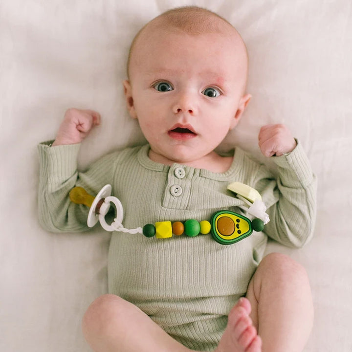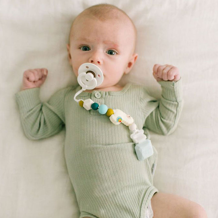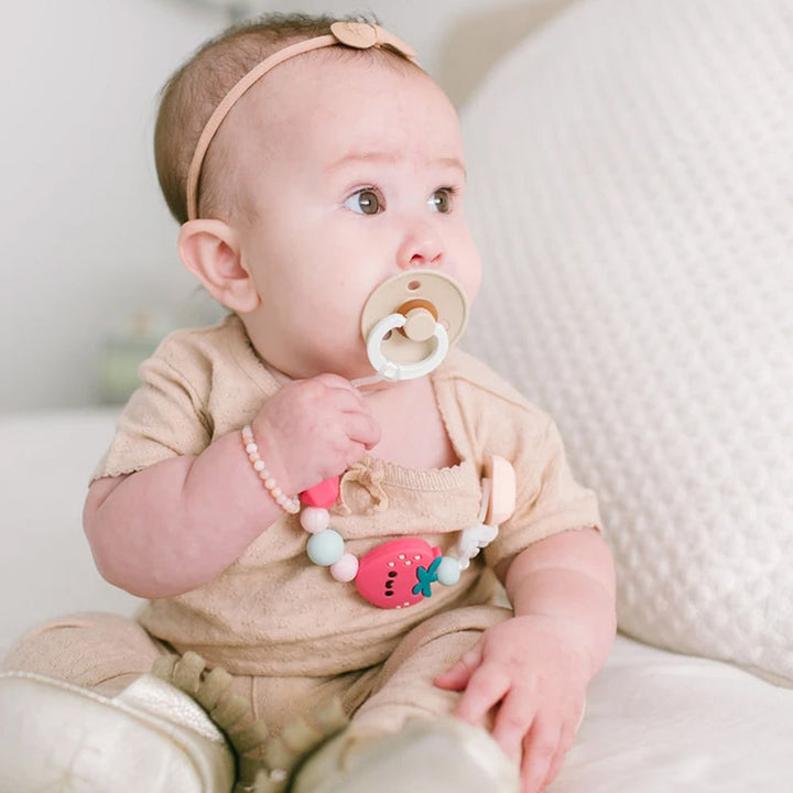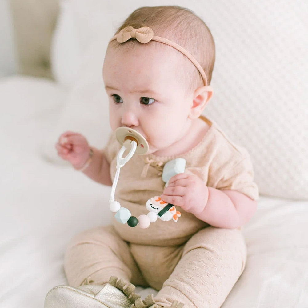 Featuring differently shaped food grade silicone beads, Lolou Lollipop's Darling baby pacifier clip is an adorable way to keep soothers, teething rings or toys close at hand (and off the floor!). Simply loop baby's pacifier or toy to one end, then use the first-of-its-kind one-piece silicone molded clip to fasten the other end to clothing, blankets, car seats, strollers or diaper bags.
