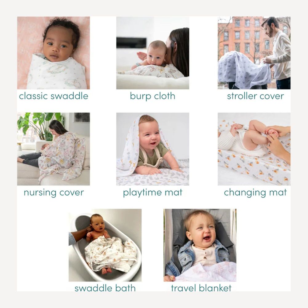 - Seriously versatile: Sized for swaddling, tummy time, stroller coverage, burping, nursing, on-the-go changing and more.