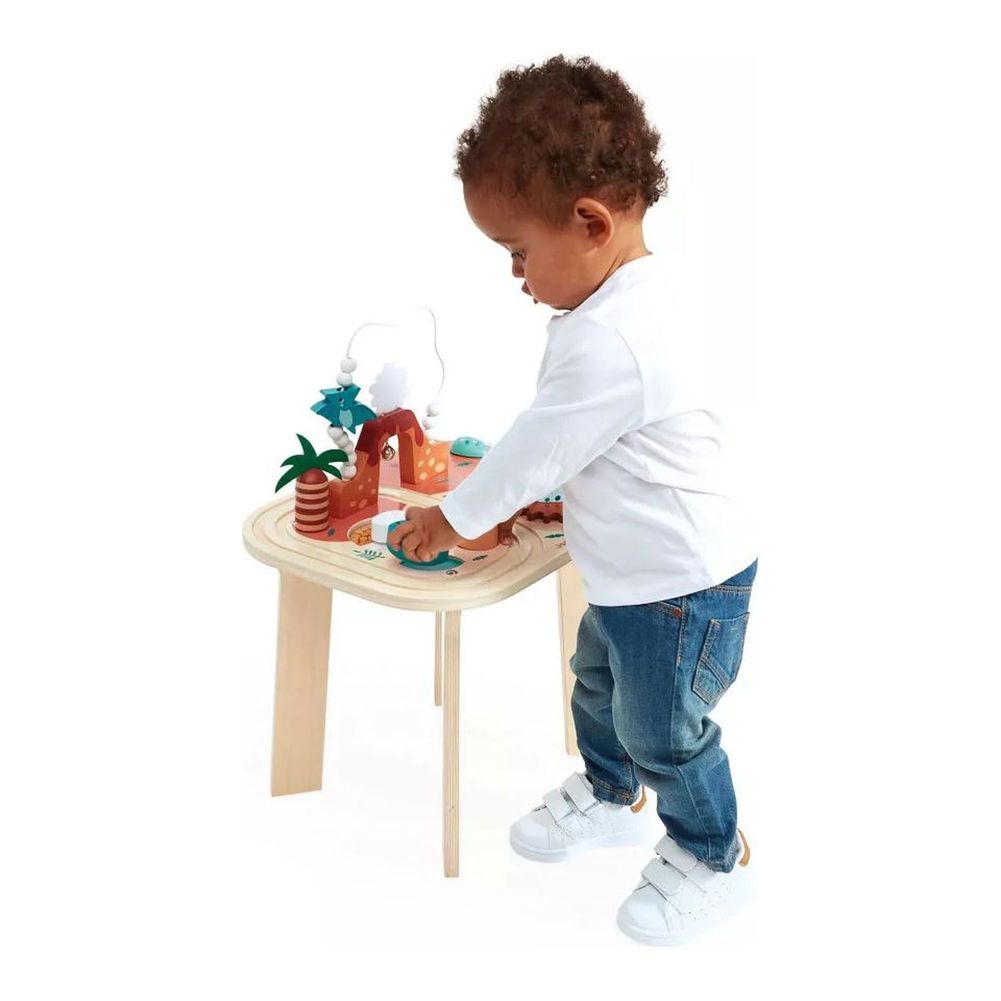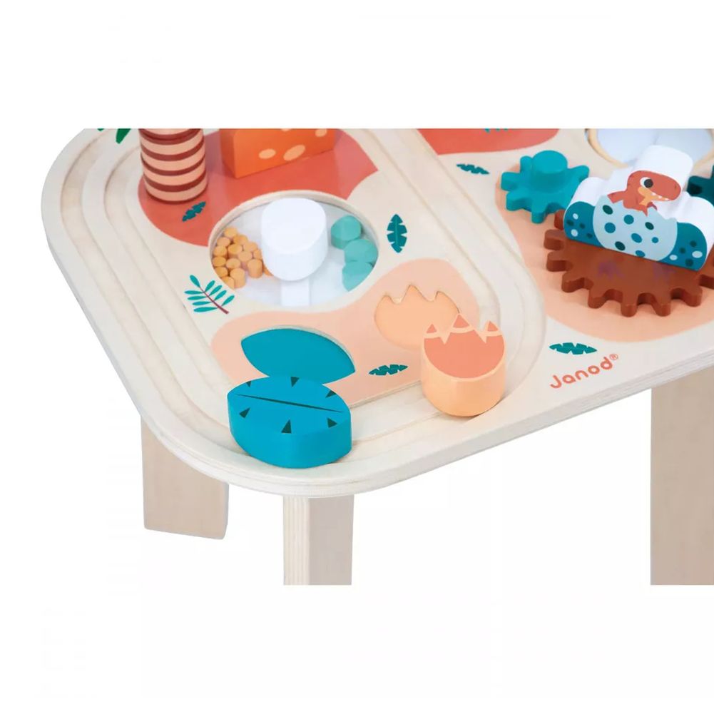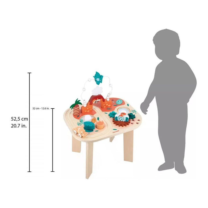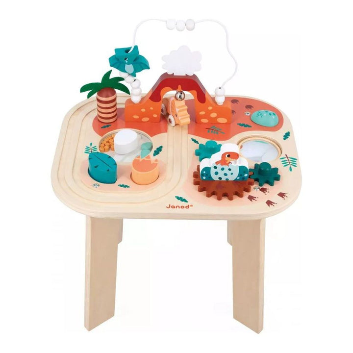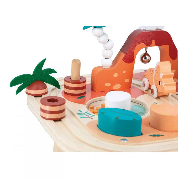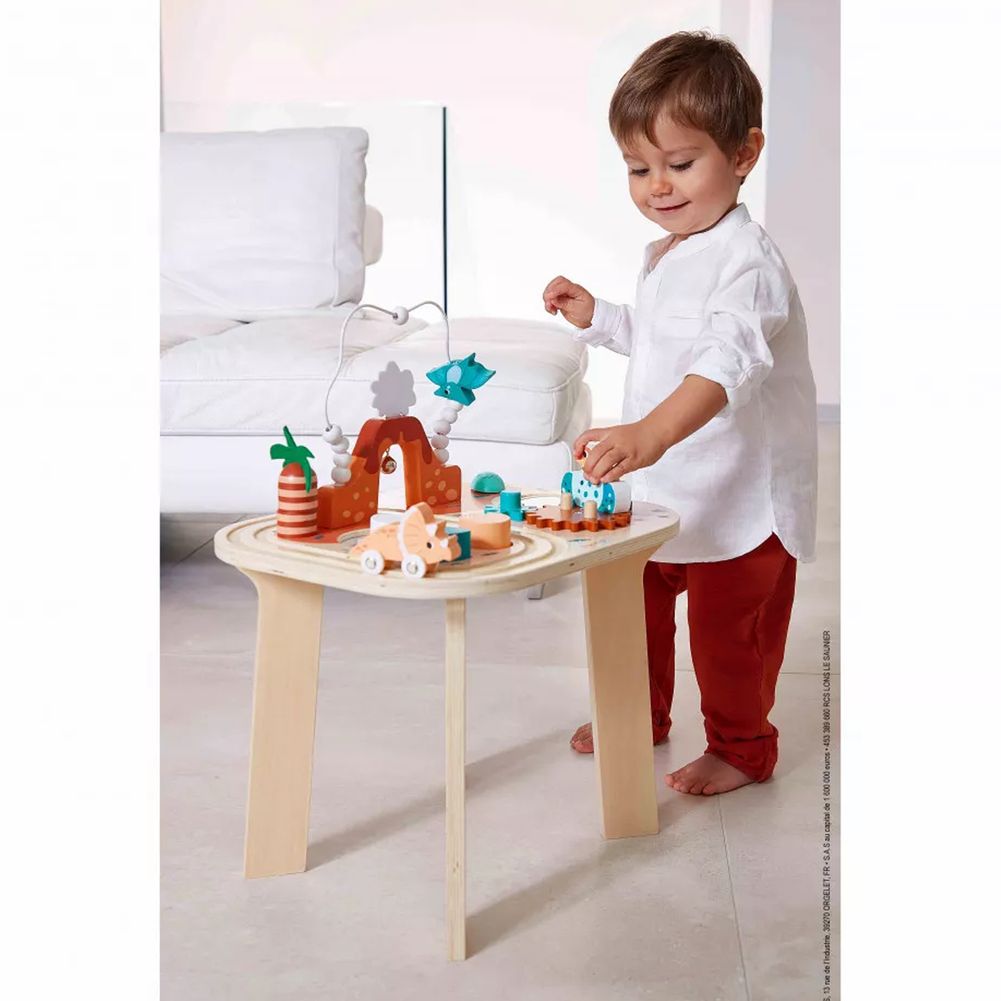 Let's head back to the prehistoric era, at a time when dinosaurs roamed the earth, much to our little ones delight! On this magnificent rust and blue-toned wooden activity table, everything comes together to transport children aged 12 months and up to an extraordinary universe: a volcano mid-eruption, baby dinosaurs hatching from their eggs and even flying creatures! The day’s schedule for this trip in the heart of the Jurassic - 8 different activities to help develop babies' curiosity, motor skills and concentration: a triceratops that wheels along its track which passes under the volcano to ring the bell, an abacus comprising 10 wooden beads and a pteranodon in full flight, a 3-piece palm tree-shaped stacking toy, and even slot-in wooden pieces in the shape of a footprint and leaf. This complete activity game also includes a good visual experience as the rotating egg moves the other small eggs in the tray, plus there are gear wheels, an egg which makes a noise when you turn it and a distorting rotating mirror to make children laugh. All the details on this beautiful wooden early-learning toy are superb: the different play areas are sectioned off with pretty colours, the smoke rising from the volcano is made from very soft felt, and the dinosaurs’ eyes are so round that you’ll want to adopt one of them! This game is made from FSC® wood. The board measures 32 cm high and rests on 4 very stable legs.