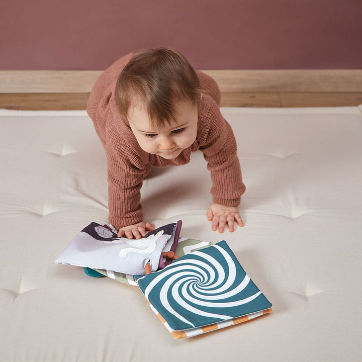 Indeed, they offer contrasting colors and prints, particularly perceptible by baby from birth: ideal for visual stimulation! In addition, 6 varied textures can be discovered with your fingertips (micro-velvet, corduroy, suede, looped fabric, cotton muslin, felt): they are therefore not only visual stimulation cards, but a perfect toy for develop toddler's sense of touch. They arouse his curiosity, because they are designed especially for him. Connected together by a silicone ring, they can be presented to baby like a fabric activity book, but also placed on the ground to encourage their exploration. The ring is easy to handle, and can be put in the baby's mouth like a teething ring. It is a portable sensory awareness toy, easy to carry on outings with baby. A useful birth gift, therefore, but also adorable like the little cat represented on the front.