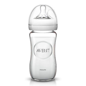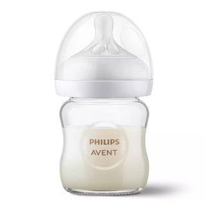 The Natural Glass wide-neck bottle from Philips AVENT includes a wide, breast-shaped nipple with an innovative petal design that promotes a natural latch on similar to the breast, allowing for...