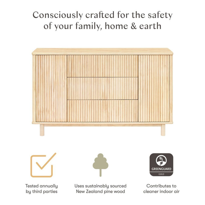 The timeless Babyletto Pogo Tambour Assembled Dresser exudes modern elegance with its textured fluted tambour paneling, smooth, rounded edges, and elevated silhouette. Designed for the nursery but beautiful enough for use throughout the home, it features push to open smooth-gliding drawers, spacious side cabinets, included anti-tip kit for safety, and best-of-all, it arrives fully assembled, ready out of the box.