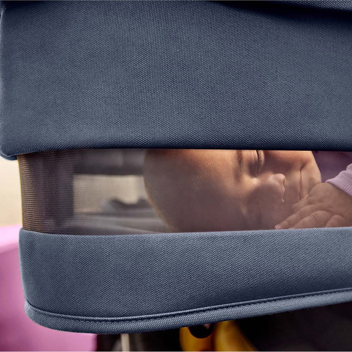 A sleek bassinet design with a new ventilation system will keep your baby comfortable and regulate their temperature both indoors and outdoors. It becomes breezy in just 1 second, and when sealed, offers superior protection from the elements (tested with a wind turbine on approx. 31.07 mph). The soft transparent mesh also allows your baby to discover their first glimpses of the world and each other when in twin mode. Partnered with the breezy peekaboo canopy window it allows you to connect with your curious co-pilot.