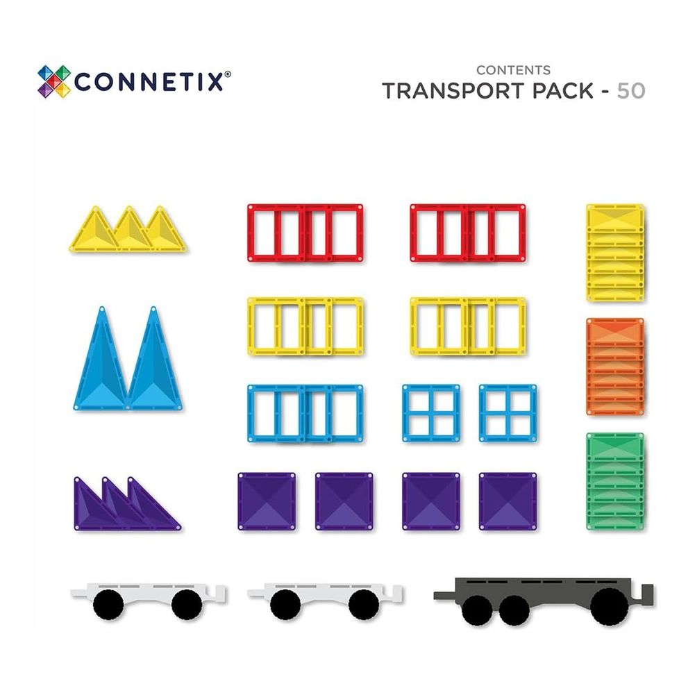 Designed with vehicle enthusiasts in mind, this pack takes magnetic tile play up a gear! Featuring our iconic REVERSIBLE transport base, two clear motion bases with REAL rubber wheels, plus a range of magnetic tile shapes, the CONNETIX 50 Piece Rainbow Transport Pack allows you to imagine and create endless vehicle designs.