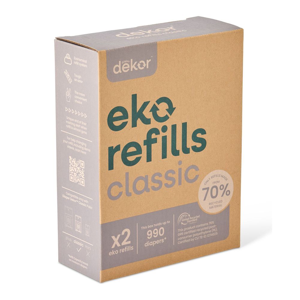 - EXCLUSIVELY FIT NEW Dekor Eko CLASSIC Pails and Original Dekor CLASSIC Pails. Each Box Contains 2 Eko CLASSIC Refills and Holds Up to 990 Newborn Diapers.