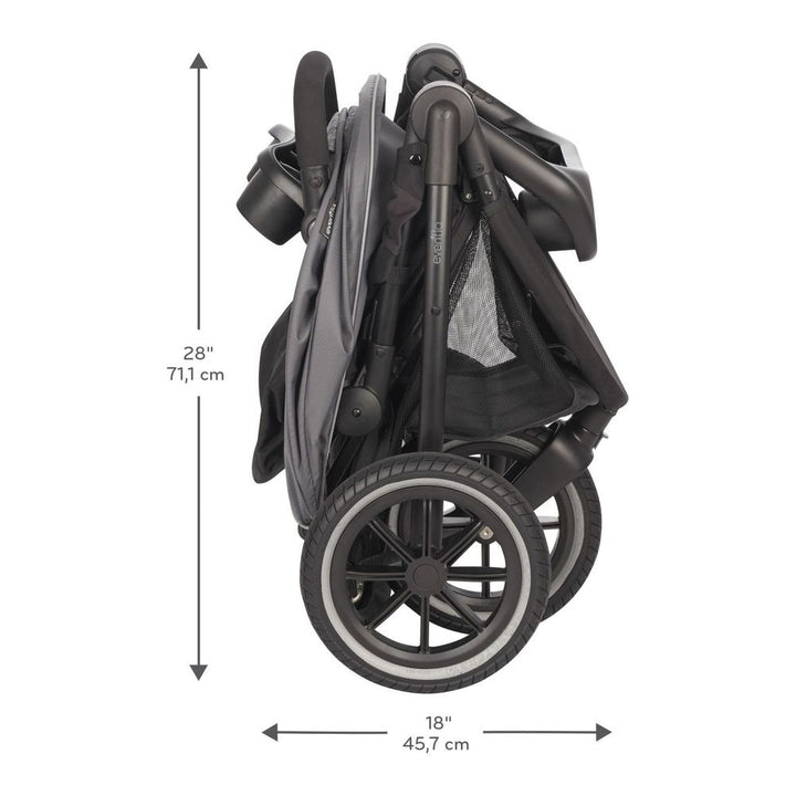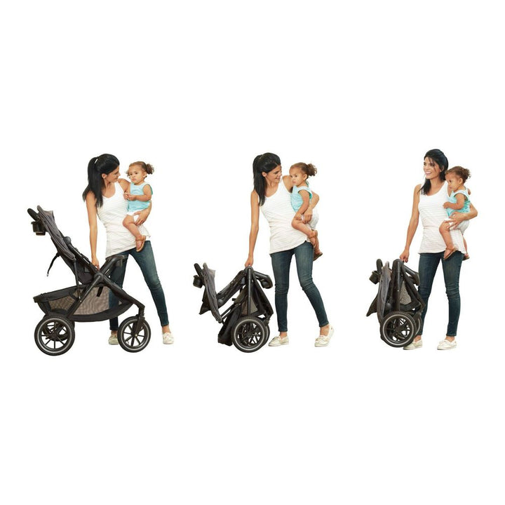 The ultimate crossover stroller; the Evenflo® Folio3™ Stroll & Jog Travel System is the best of both worlds. Fully-featured and lightweight for everyday strolls; with the added benefit of large, air-filled tires and a lockable front wheel for all-terrain jogging. The unique, in-seat fold is more compact than than most full-size strollers, and self-stands so you never have to bend over to put it in your vehicle. An oversized storage basket, parent and child consoles and a full-coverage canopy with peek-a-boo window come in handy for shopping and trips to the park, while the pneumatic tires, front-wheel swivel lock and adjustable handle give you the performance you need when jogging!