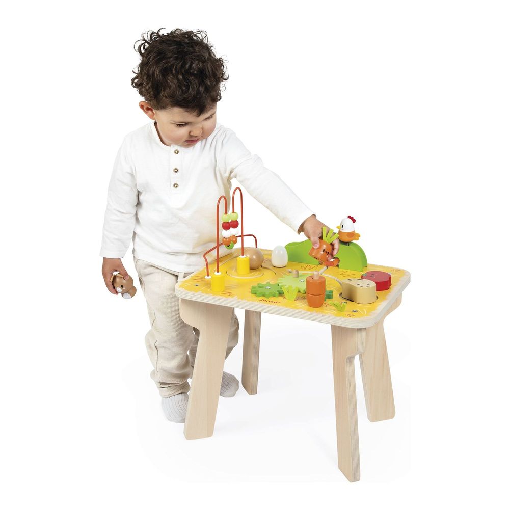 Come on, let's introduce your child to new games with this ultra-complete wooden activity table featuring 7 of them: 1 circuit where a spring-loaded chick pushes a wooden ball down a hill, 1 looping bead circuit with 9 sliding wooden beads, 3 gears with 1 removable rabbit, 1 stackable carrot, 1 potato and 1 tomato, 1 maze with another chick running to hide under the hill, and 1 rotating sound egg. With this first-age wooden play table, children aged 12 months and over will go from discovery to discovery in a world they'll love! We love the country-style design of this activity table, with its adorable wood and felt characters to encourage tactile discovery. From the age of one, toddlers begin to explore their environment. They not only manipulate their early-learning toys, but also stand up to see higher and further.