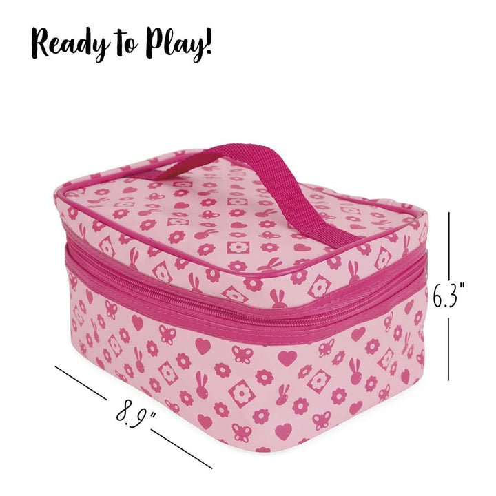 - DURABLE WOOD CONSTRUCTION – Includes a large mirror, makeup palette with brush and built-in mirror, 2 lipsticks, 2 nail polishes with removable caps and brushes, 1 eyeliner pencil, 1 perfume bottle, and a brush. Zippered case measures 22. 5 x 17 x 16 cm (8. 9 x 6. 7 x 6. 3 in).
