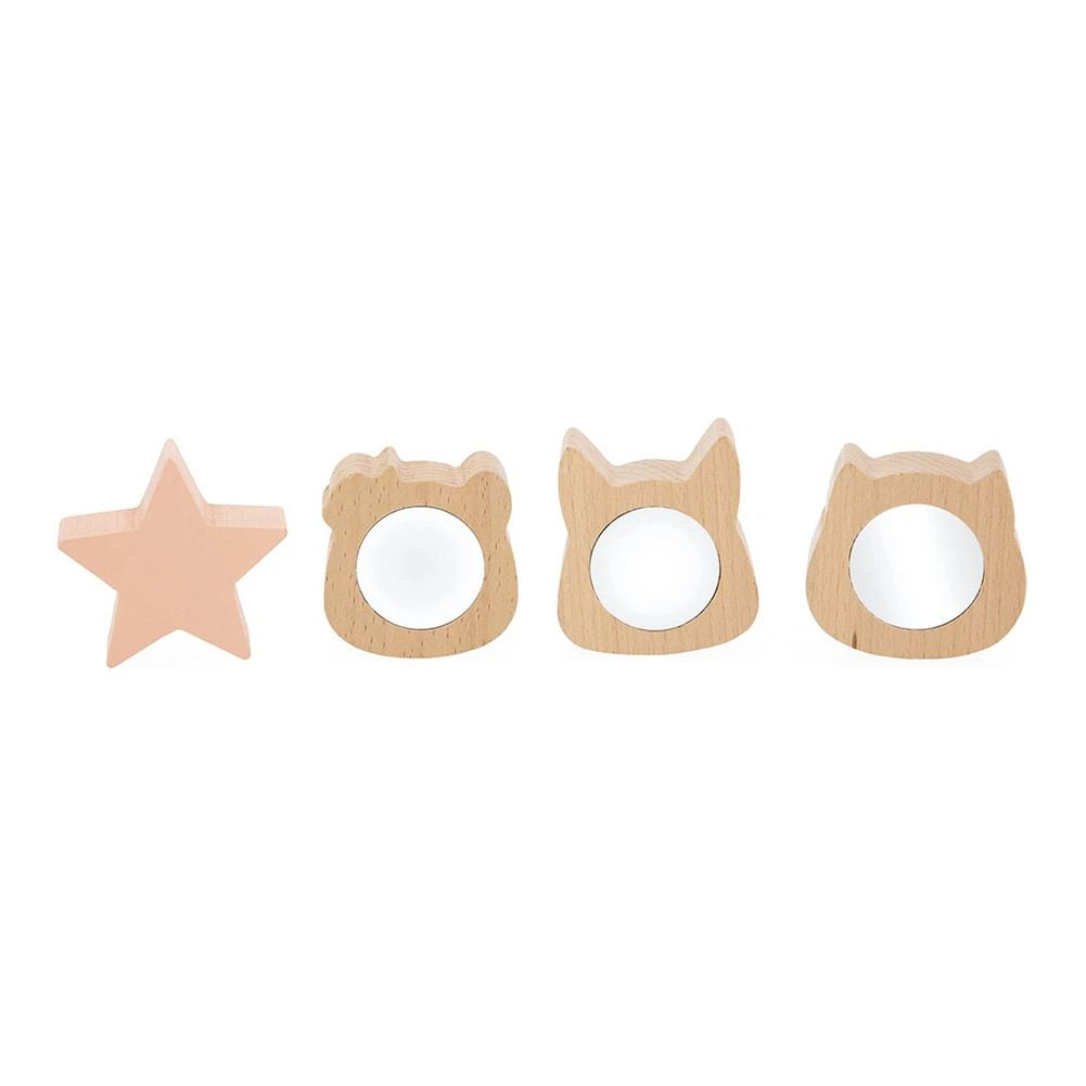 There's a star and three adorable animal heads: a panda, a cat, and a fox. The fun part? Behind each head is a distorting mirror that will make little ones giggle! Baby slips their little hand into the box… surprise! A soft tissue appears. And then, another one that's all rough! Each fabric is a new discovery to touch, pull, and crumple. Baby will find four tissues with varied textures. Enough to satisfy their curiosity and desire to explore! The little wooden doors on the sides open so easily… and voilà , baby can easily retrieve the pieces they've put in the box. A simple gesture that extends playtime and encourages independence!