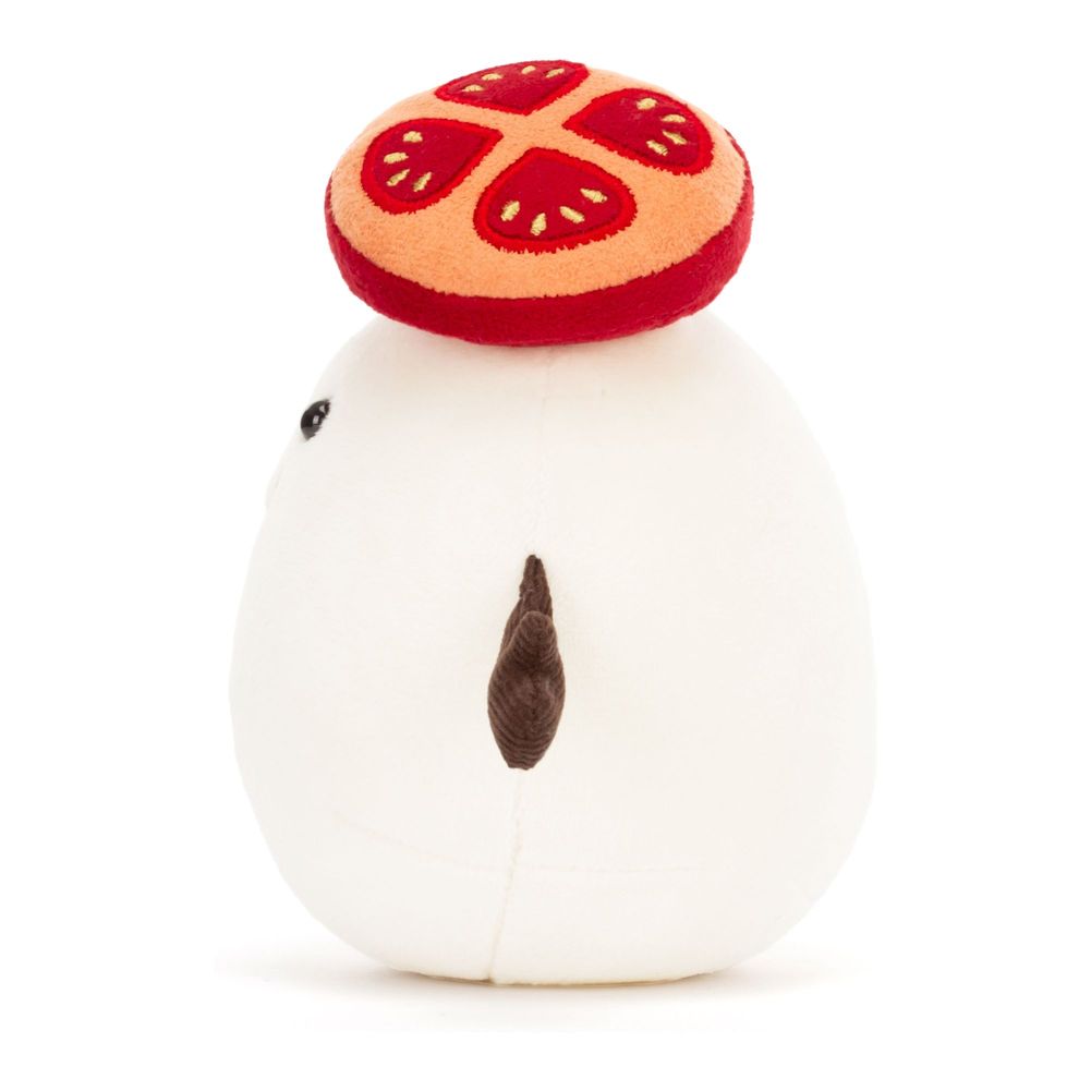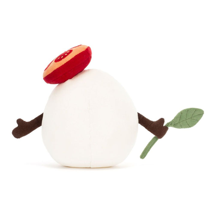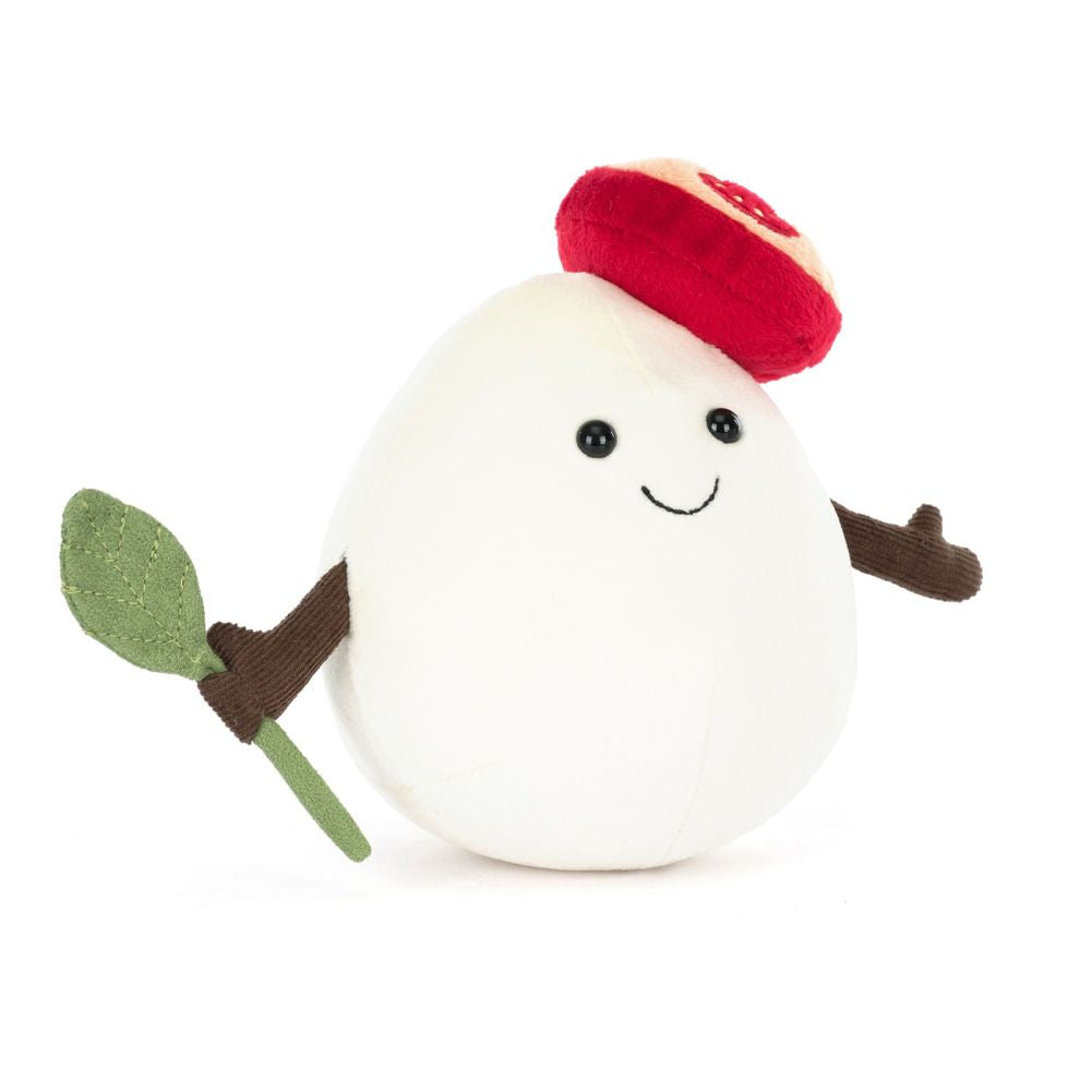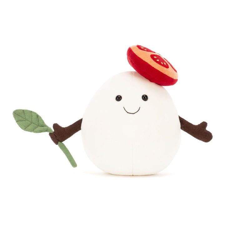 Amuseables Mozzarella is a cuddly Caprese cutie. A soft ball of cream fur, this fromage friend is adorned with a big smile and a chunky slice of textured tomato. With cocoa fine cord arms holding a suedette Basil leaf, this cheese sweetie is the perfect gift for foodie friends and cheese lovers alike!