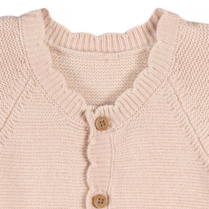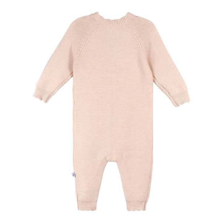 Dress your baby girl in premium comfort with Just Born's cozy sweater knit coverall. Crafted from plush, super soft viscose, this coverall ensures a luxurious feel for your little on. The slight stretch in the material allows for easy movement during all her active adventures. Convenient leg snaps make diaper changes a breeze, while the faux wood buttons simplify dressing. Decorated with scalloped detailing at the neckline, wrists, and ankles, this adorable coverall combines style and practicality, making it a delightful addition to your baby girl's wardrobe.