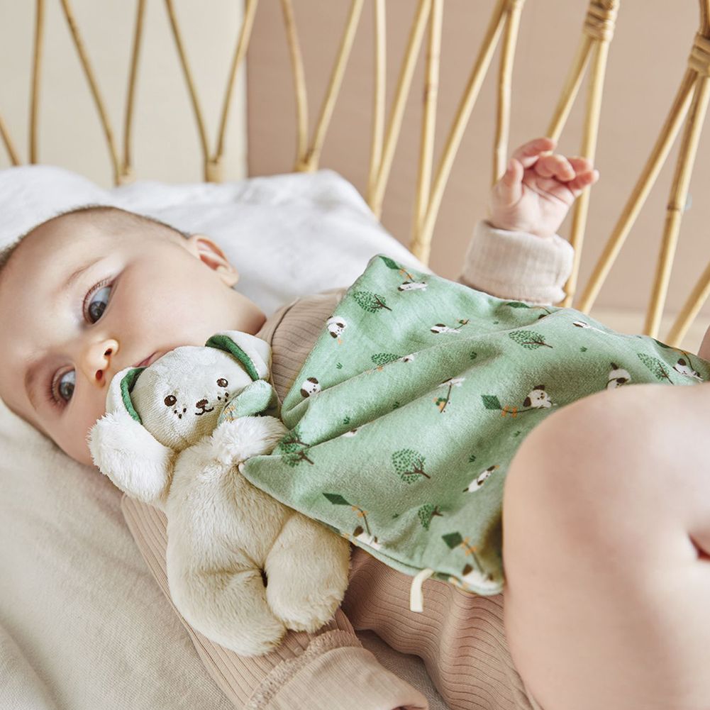 This marshmallow-soft puppy can easily be grasped by baby and will win over the whole family with its cute little face. This dog plush is holding a beautiful soft square comforter with an ultra-special print: it features a small dog playing in the garden, allowing you to create related stories or watch baby curiously observe the illustrations as they get older! Little ones will love the square comforter and cuddle it close to them. They can also wrap the little dog in a warm and reassuring blanket. We have painstakingly hand-picked the materials and print details. As a result, the little dog’s ears match the flat comforter. The stuffed dog and square comforter measure 14 and 18 cm, respectively.