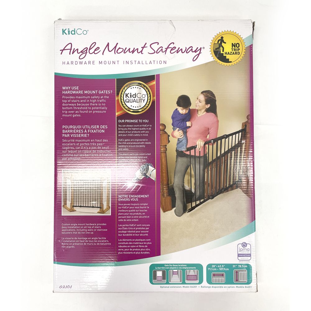 The KidCo Angle Mount Safeway®is THE gate for all top of stairs applications, including walls or staircase balusters that do not line up, but can also be used in hallways or as a room divider. As a hardware mounted gate, it provides maximum safety at the top of stairs and in high traffic doorways because there is no bottom threshold to potentially trip over as found on pressure mount gates. Optional 10” extensions are available for larger openings up to 63”.