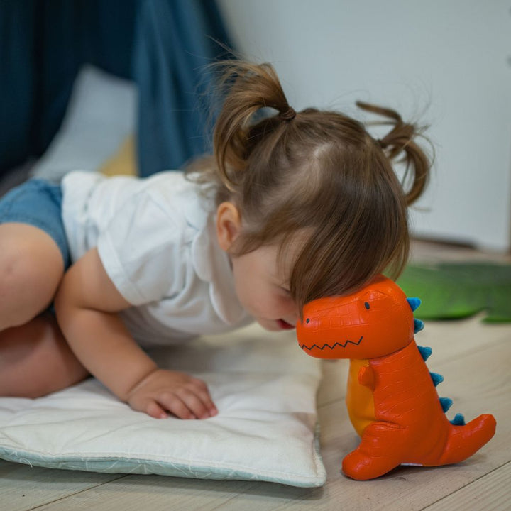 Rex the Tyrannosaurus is an adorable, brightly-colored dinosaur who will brighten any child's day. Made from vegan leather, Rex hides a bell that tinkles softly with every movement. The textured material of his red-scaled body, the smooth feel of his orange belly and the soft velvet of his blue crest will awaken the curiosity of young explorers. Rex and his friends are perfect for decorating a child's bedroom and will stay with him for a long time.
