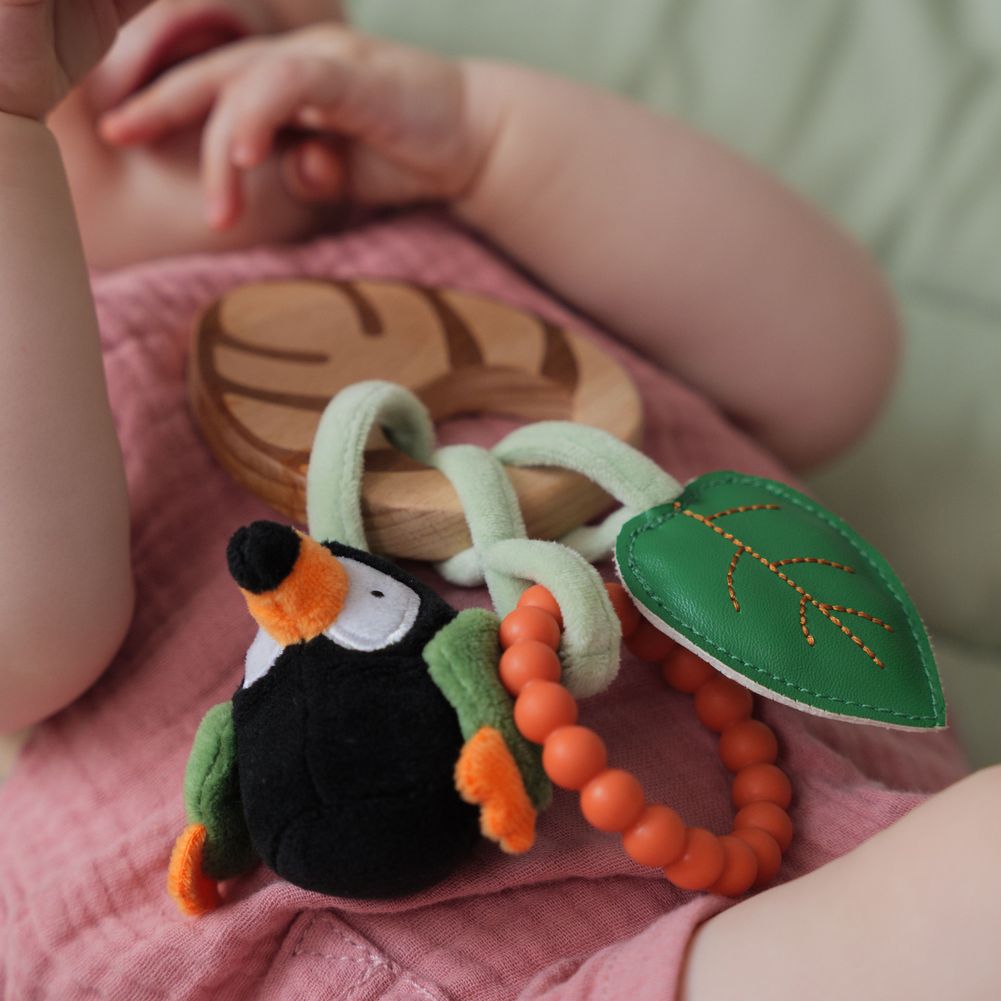 The Little Big Friends Wooden Sensory Rattles come in many adorable shapes, with three activity toys to stimulate baby's curiosity with different textures and materials. The three cotton cords hold hanging elements to stimulate the senses: crunchy fabric , two colorful rings and a soft plush toy head.