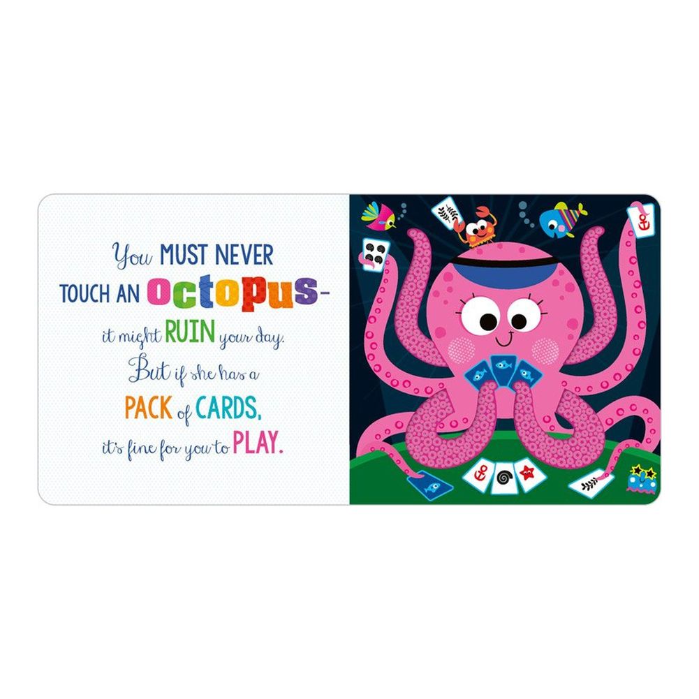 You must never touch a shark . . . except in this book! This ocean-themed touch-and-feel book is perfect for young children. They will love reading the funny rhyme that warns of the dangers of touching a shark – and then ignoring the advice! Innovative silicone touches feature throughout the book, with a different texture for children to explore on every spread.