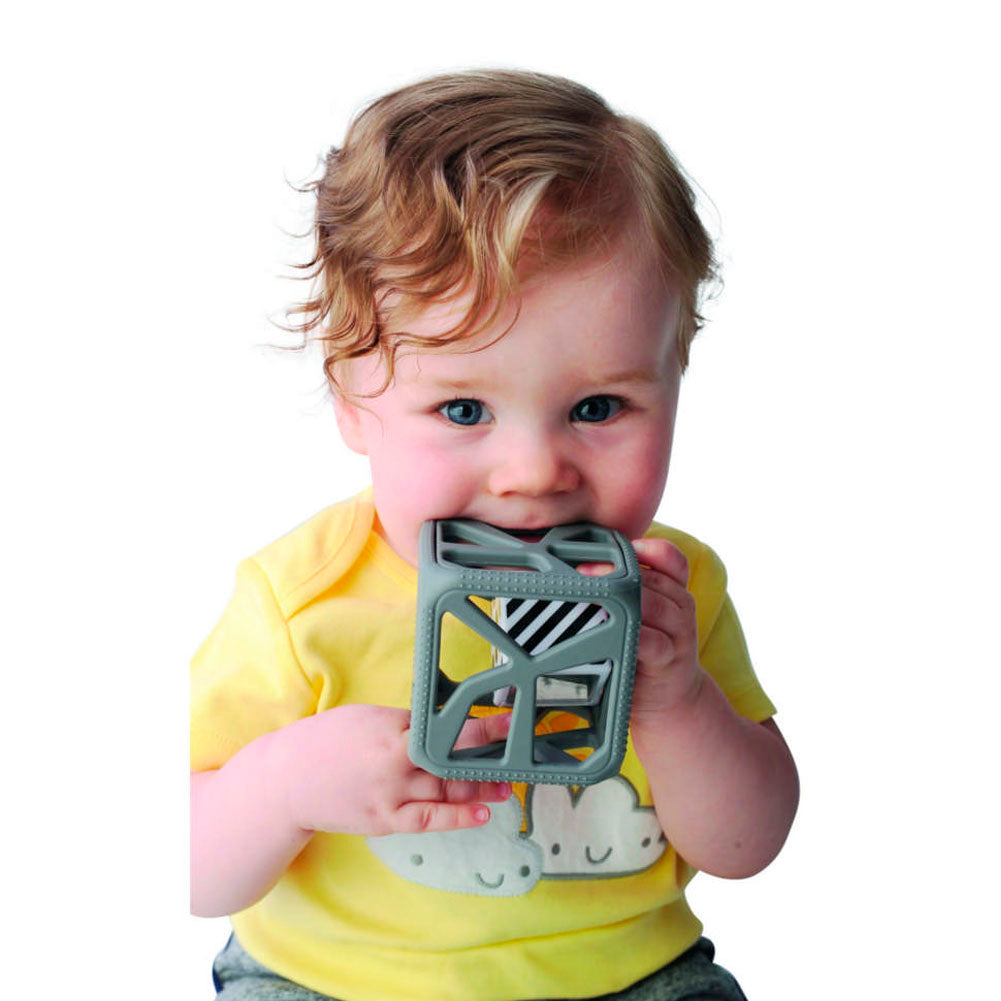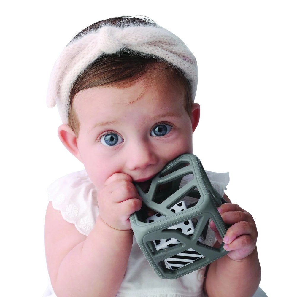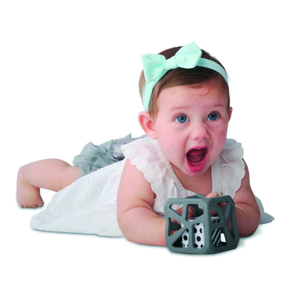 The Malarkey Kids Chew Cube is the mom-created modern rattle and teether. Offering four-way sensory stimulation to help aid in achieving baby's milestones, including soft, textured teething edges for tender gums; large flexible holes to help baby with gripping skills plus a black and white patterned rattle with mirrors to provide stimulation for baby's ears and eyes.