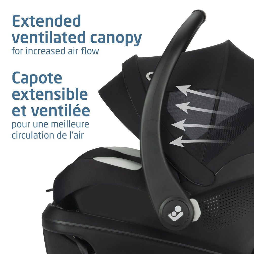 Your baby’s safety and comfort come first. The ClimaFlow™ technology shell provides added ventilation to keep your baby cooler. Side impact protection and plush padding on the removable infant head and lumbar inserts ensures a secure fit and cozy ride. Plus, energy absorbing EPP environmentally-friendly foam in the headrest area to effectively manage impact energy. The extendable ventilated canopy provides maximum shade and airflow. Enjoy added style and comfort with the vegan leather-trimmed ergonomic carrying handle contoured to curve around your hip.
