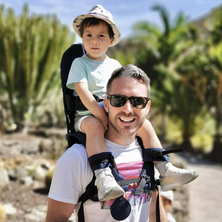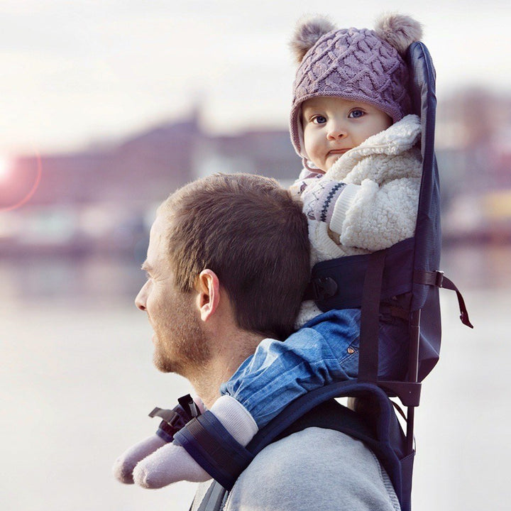 While discovering the world, your child sits safely on your shoulders secured by a waist belt and leg straps. A harness with shoulder straps is included to give extra upper body support for the smallest kids (6-10 months). An extendable padded seat provides maximum comfort for the child. The supportive backrest is designed to help the child sit up straight while sitting in the carrier on your shoulders.