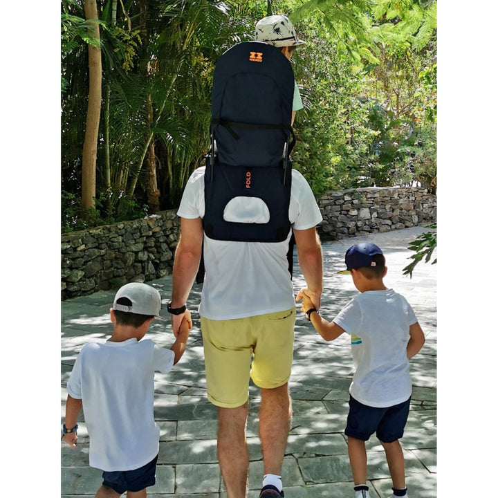 Comfort for the parent is provided by placing the child on a specially designed seat, hovering just above your shoulders, relieving your neck and shoulders from direct stress. The weight of the child is evenly distributed through the carriers’ body, which enables longer walks in comfort and style, with happy kids.