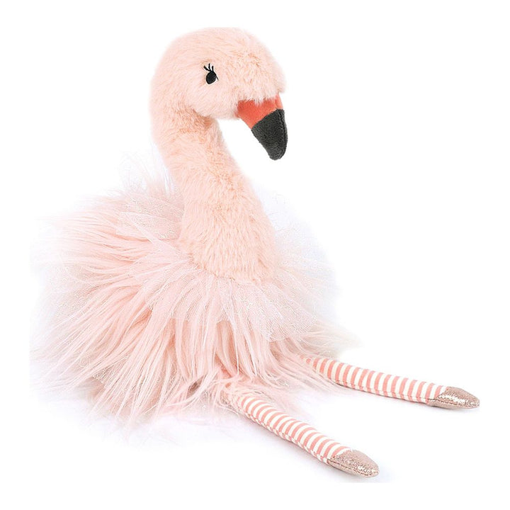 Say hello to Florine Flamingo, the picture of grace and whimsy! Sitting oh-so-pretty, this elegant plush flamingo flaunts a long, lovely neck and a chic two-toned beak. Her soft pink, feather-like wings and fabulously kick-ity long legs make her the ultimate showstopper! With sweet, expressive eyes and an adorable sitting pose, she's not just a cuddly companion—she's a total charmer. Whether for kids or grown-ups who adore these flamboyant birds, Florine makes the perfect gift, bringing a splash of fun and fabulousness wherever she goes!
