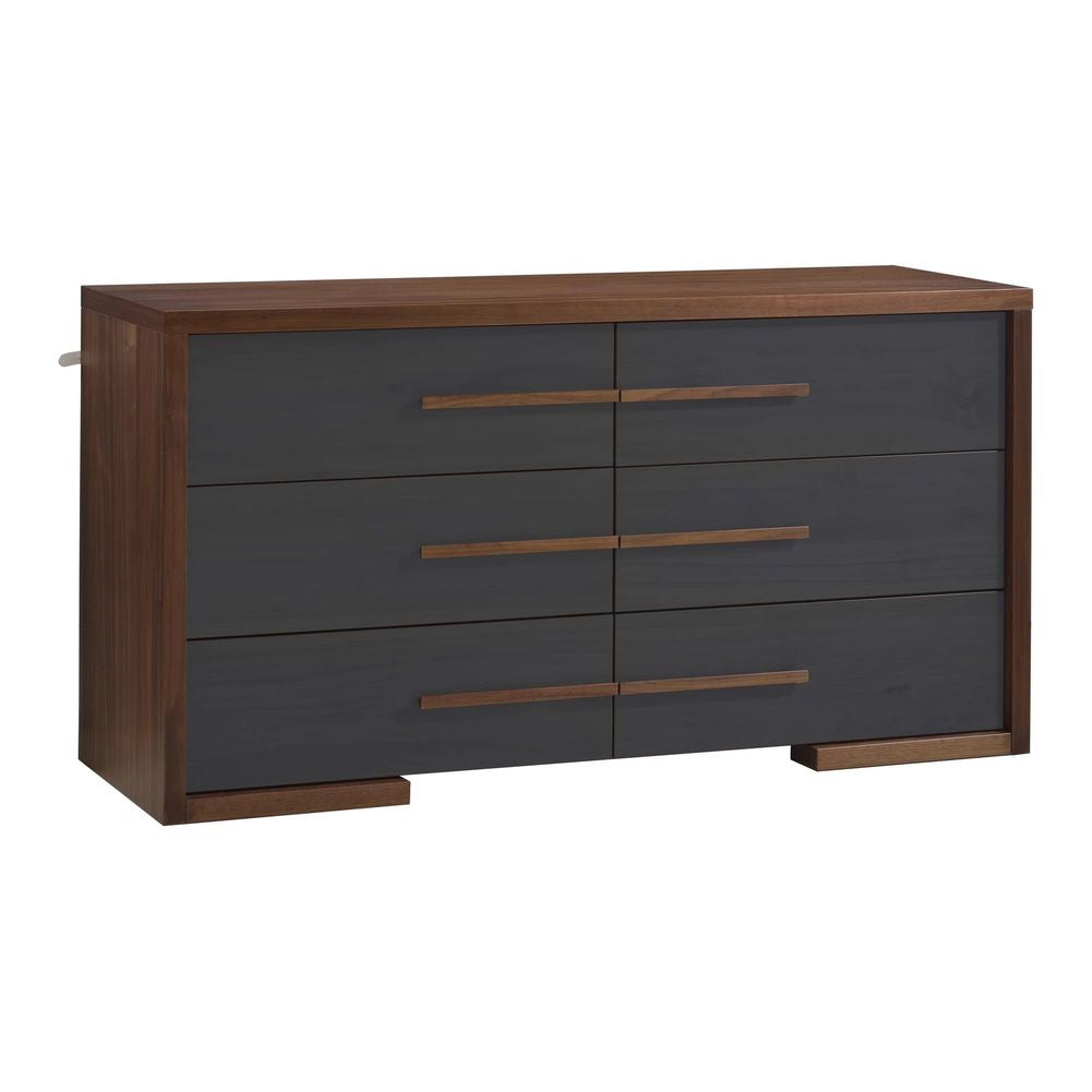 The Natart Aria collection is a modern design, made of walnut wood, features a rich, brown wood grain that is naturally beautiful and offers a unique nursery look. The cribs and dressers are available in two-tone combinations with custom made walnut wood handles.