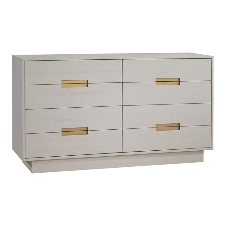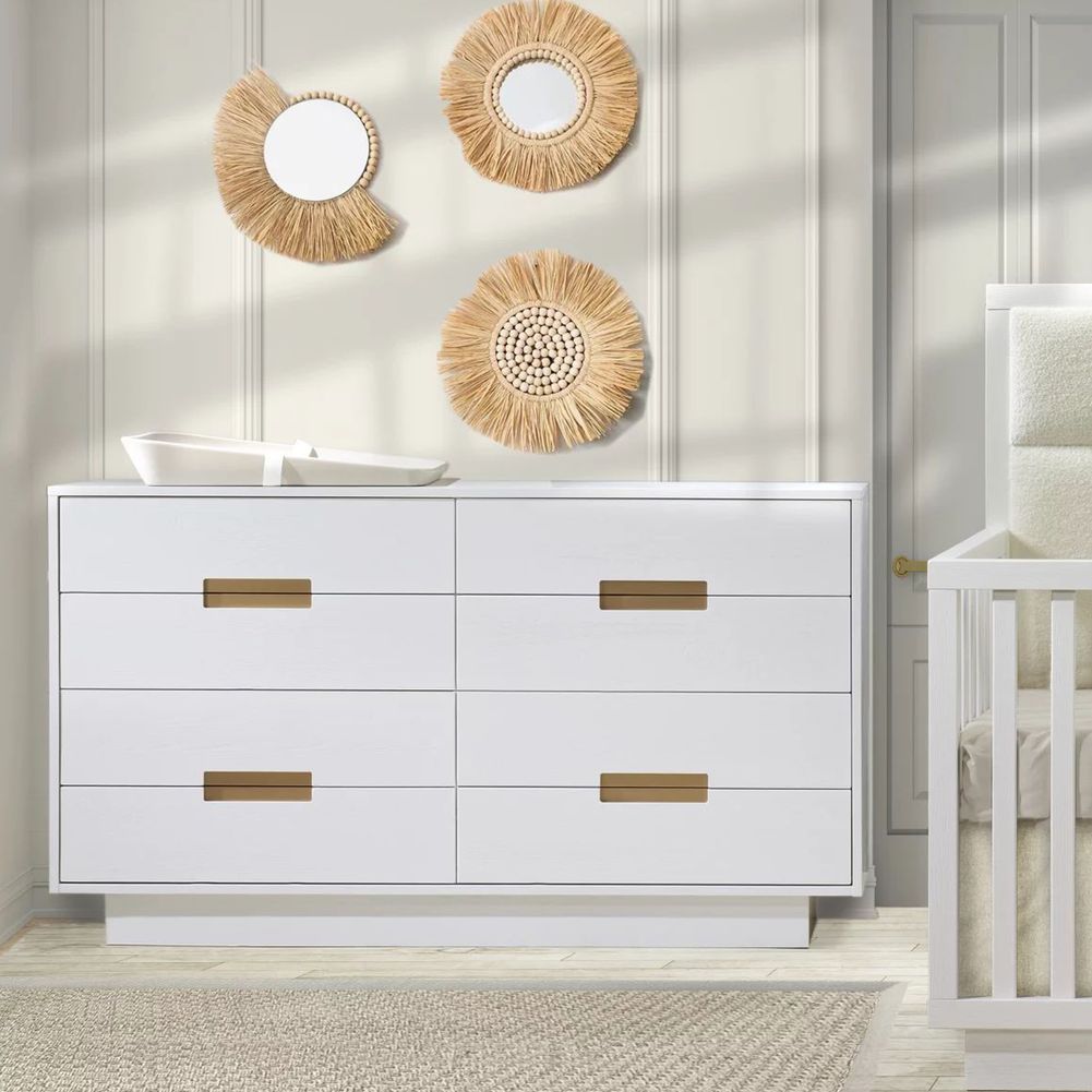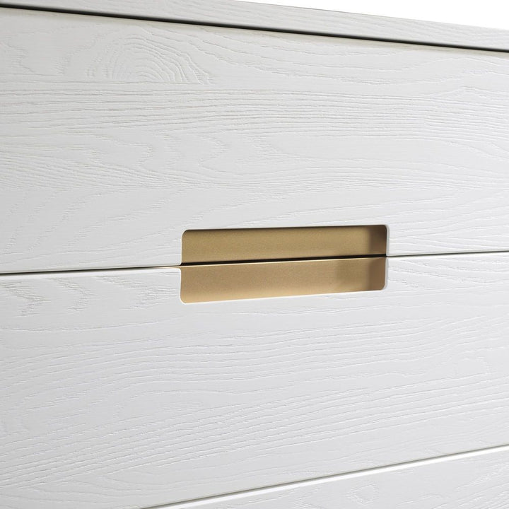 The larger dresser & chest have 8 drawers instead of the usual 6 and Custom Made recessed and discreet gold handles. Available in 3 colors on Ash wood: White, Dove and Dusk.