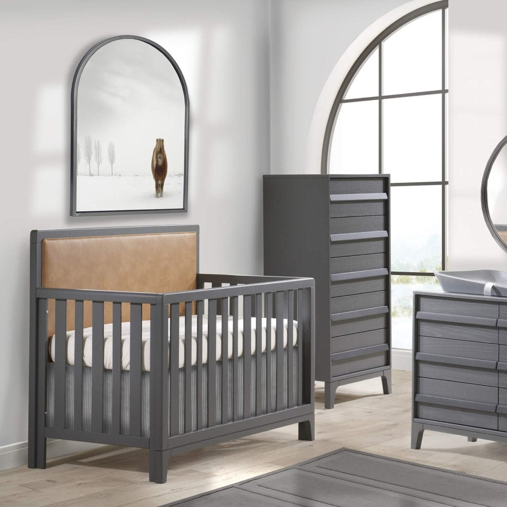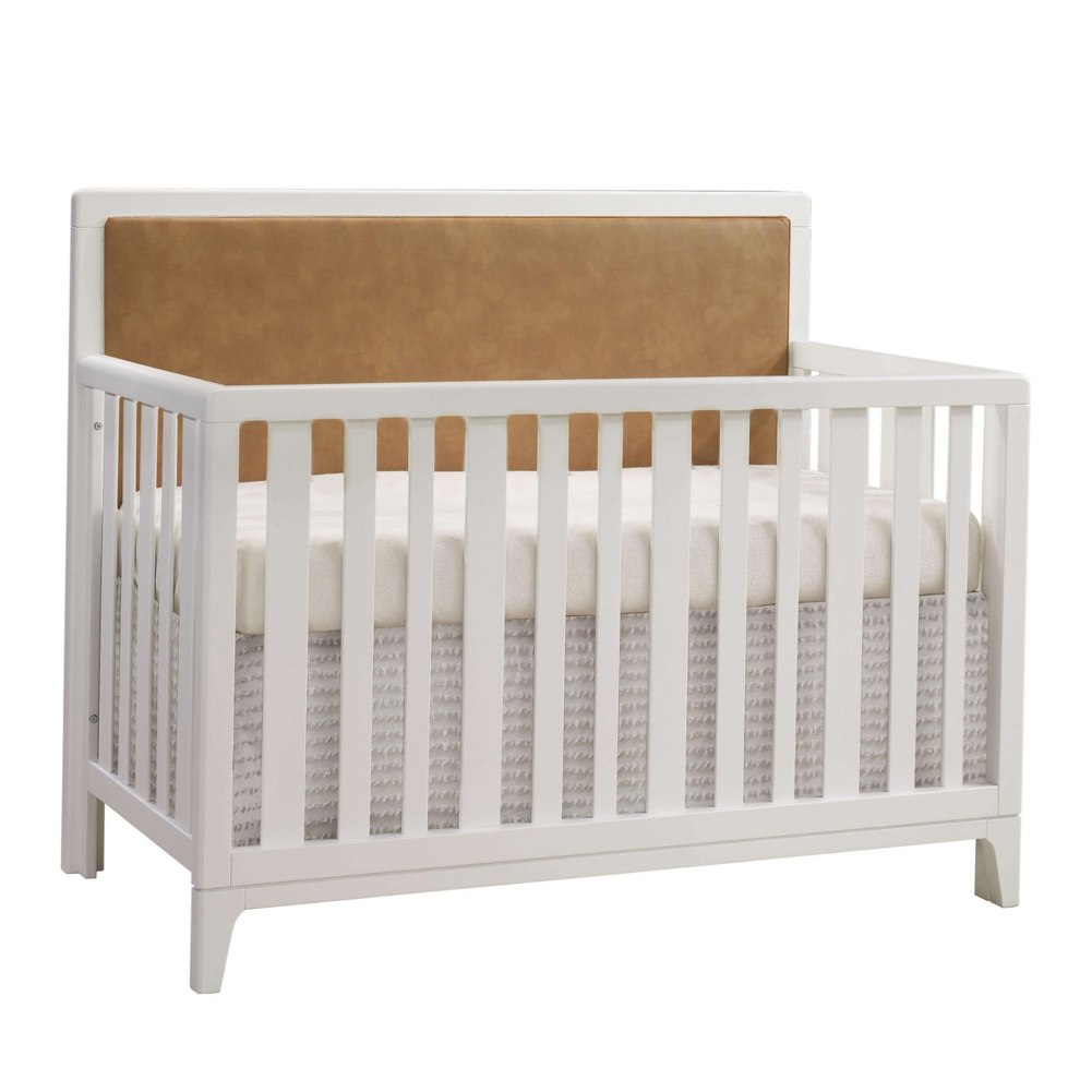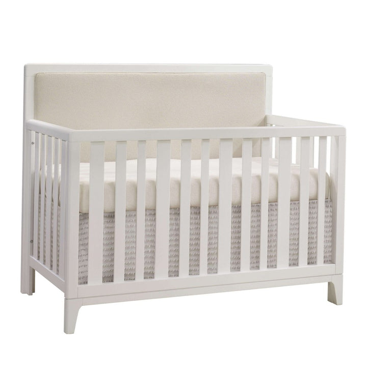 The semi-encased buttonless upholstered panel on the crib headboard is finished with a refined piping that follows the round corners of the headboard.
