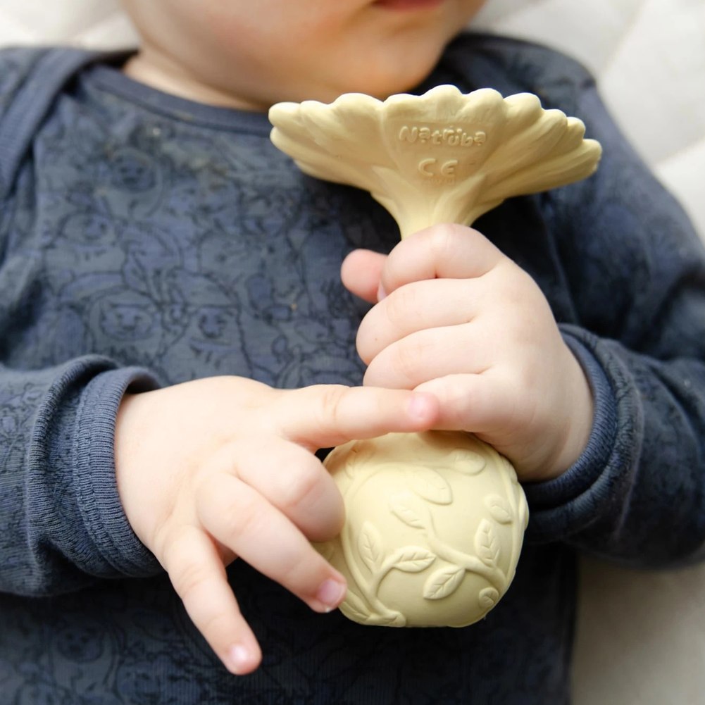 This elegantly handcrafted natural rubber flower rattle is carefully handmade.