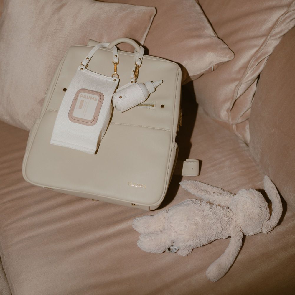 - Cream vegan pebbled leather and matte brass hardware.