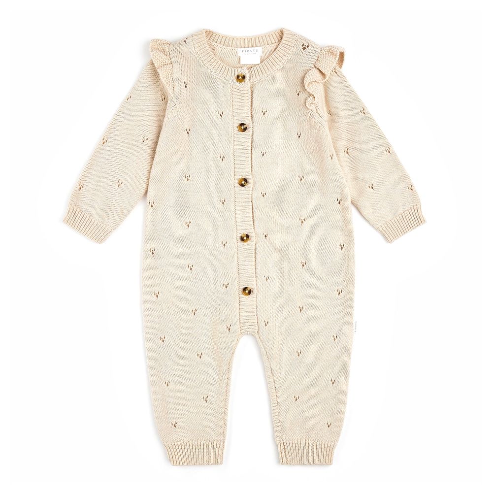 This timeless Petit Lem pointelle-knit playsuit is the perfect piece to pass down through generations. With frilly shoulders, the playsuit offers a practical fit while still making her feel super girly and stylish. With buttons all the way down the front, the playsuit can be wrapped around her and buttoned up for an easy all-day outfit.