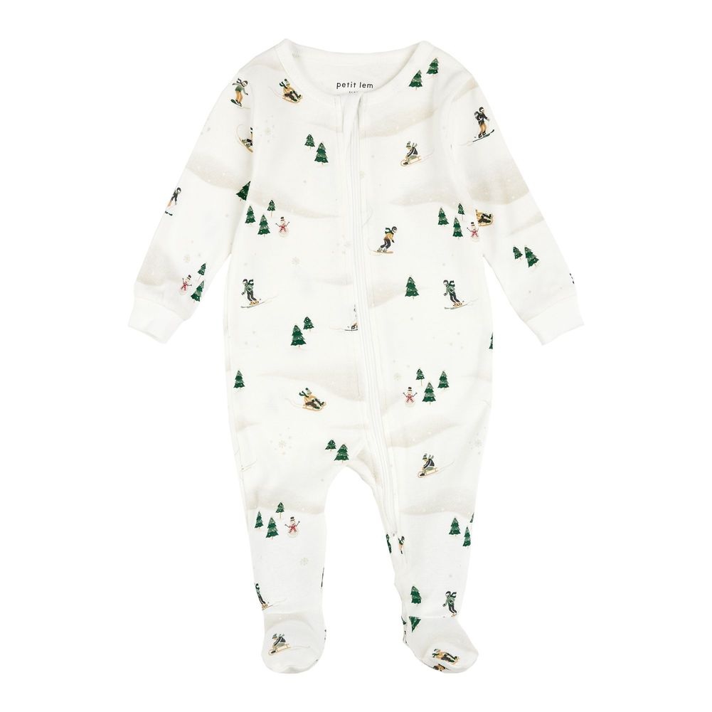 Petit Lem Organic Cotton Ribbed Footed Sleeper in Winter Fun on Off-White